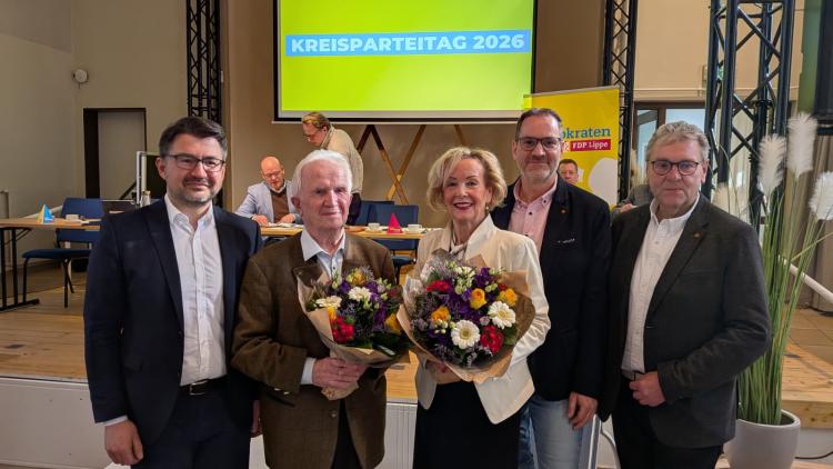 Ein besonderer Höhepunkt des Parteitags waren die Ehrungen langjähriger Mitglieder: Für 25 Jahre Mitgliedschaft wurde Manfred Vogel ausgezeichnet. Gudrun Kopp wurde für beeindruckende 50 Jahre Engagement in der Freien Demokratischen Partei geehrt. Beide stehen beispielhaft für Verlässlichkeit, politische Überzeugung und jahrzehntelangen Einsatz für die liberale Idee. Gudrun Kopp hat als ehemalige FDP-Kreis- und Bezirksvorsitzende, langjährige Bundestagsabgeordnete und zeitweise Parlamentarische Staatssekretärin im Bundesministerium für wirtschaftliche Entwicklung und Zusammenarbeit Lippe im besonderen Maße in der Bundespolitik repräsentiert. Dafür dankte ihr der Parteitag mit Standing Ovations.